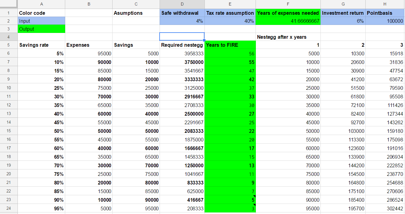 By the way. Here is a link to the calculations for saving rate and years to financial independence. You can inspect it and see where I go wrong or you can make a copy and play around with your own asumptions. I will post more advanced spreadsheets in later posts.